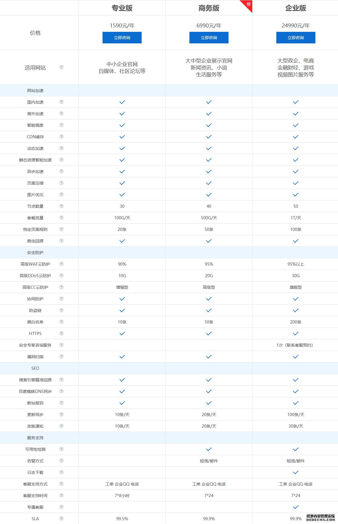| 企業(yè)版 | 電商、金融、企業(yè)站 | 50個(gè) | 1T/天 | 30W QPS | 30G | 100條/天 | 7 x 24專屬客服 | 99.9% | 24990/年 |